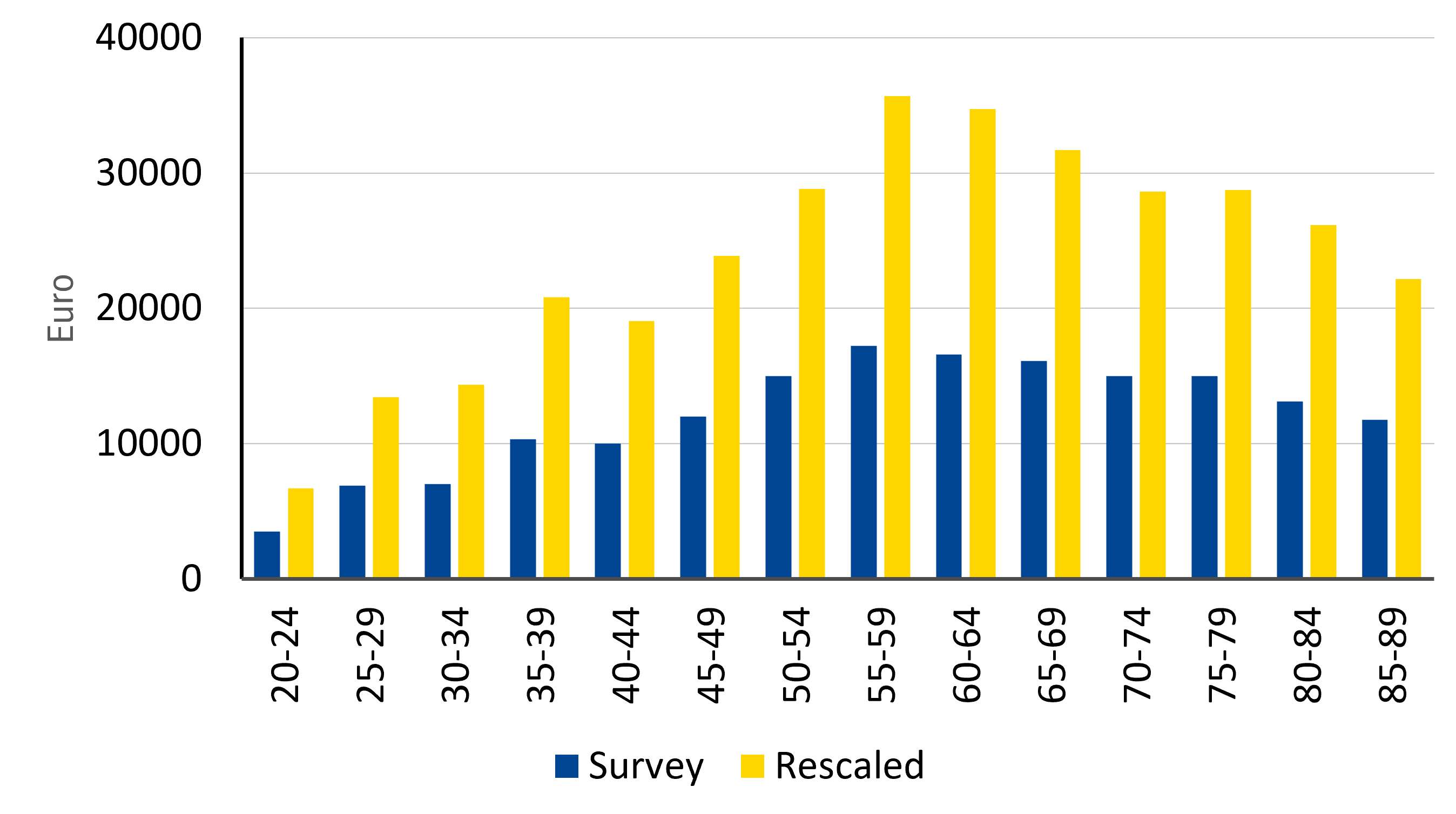 Note: The chart shows the median safe asset holdings per age bracket for all euro area households in the HFCS. The blue bars show the median of the HFCS raw data, and the yellow bars show the median of the data rescaled to match national account aggregates from the Quarterly Sector Accounts.
