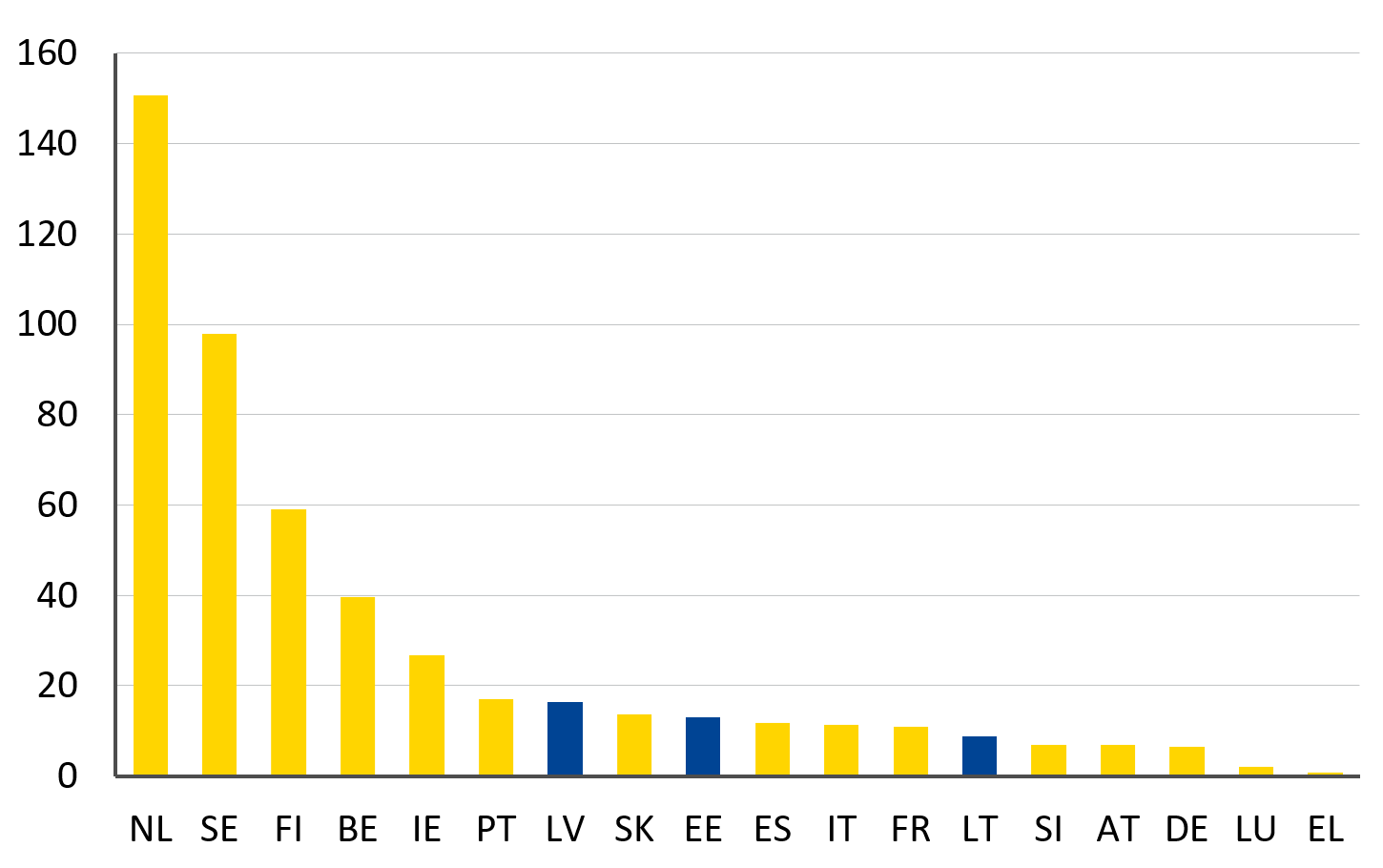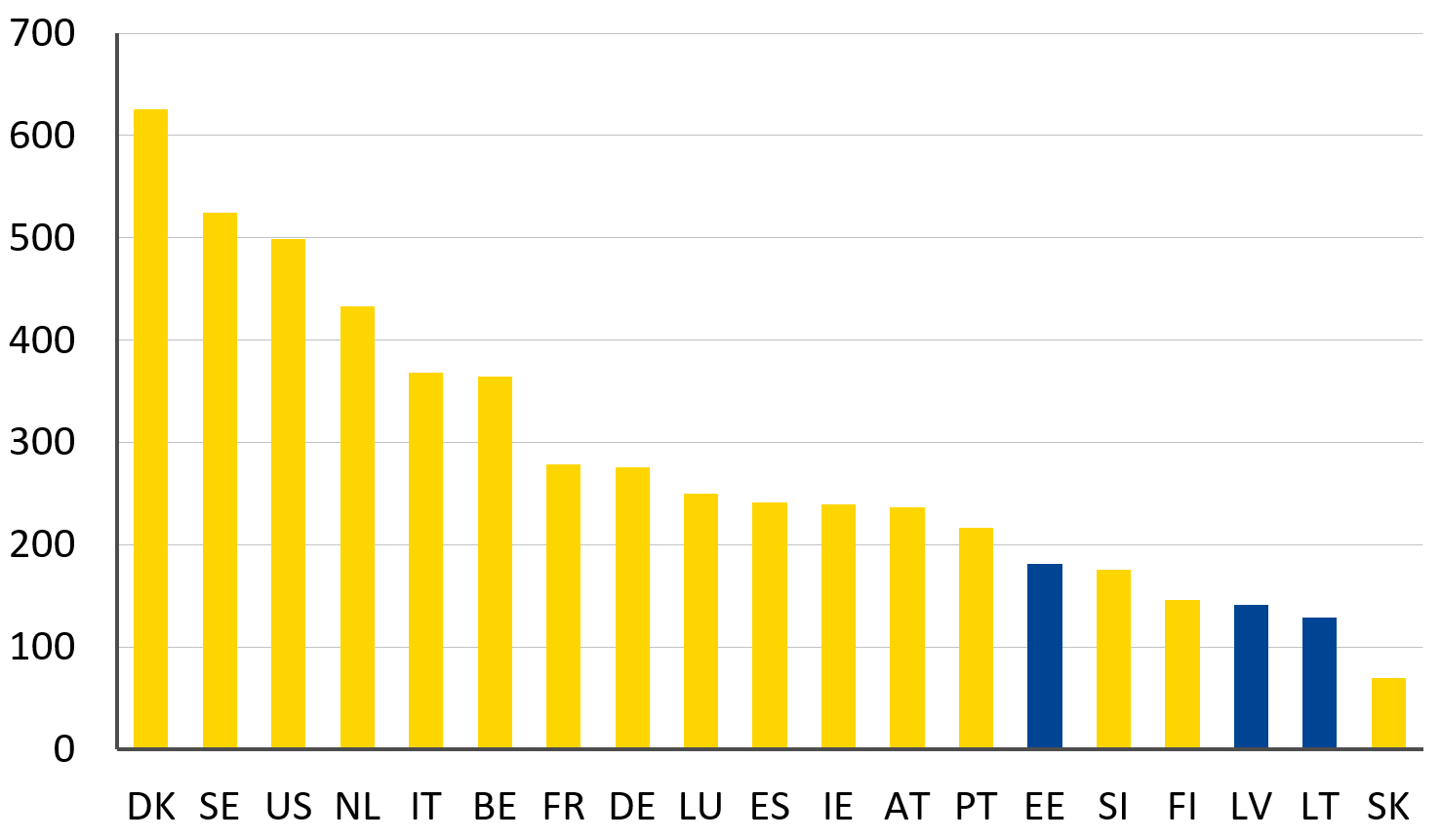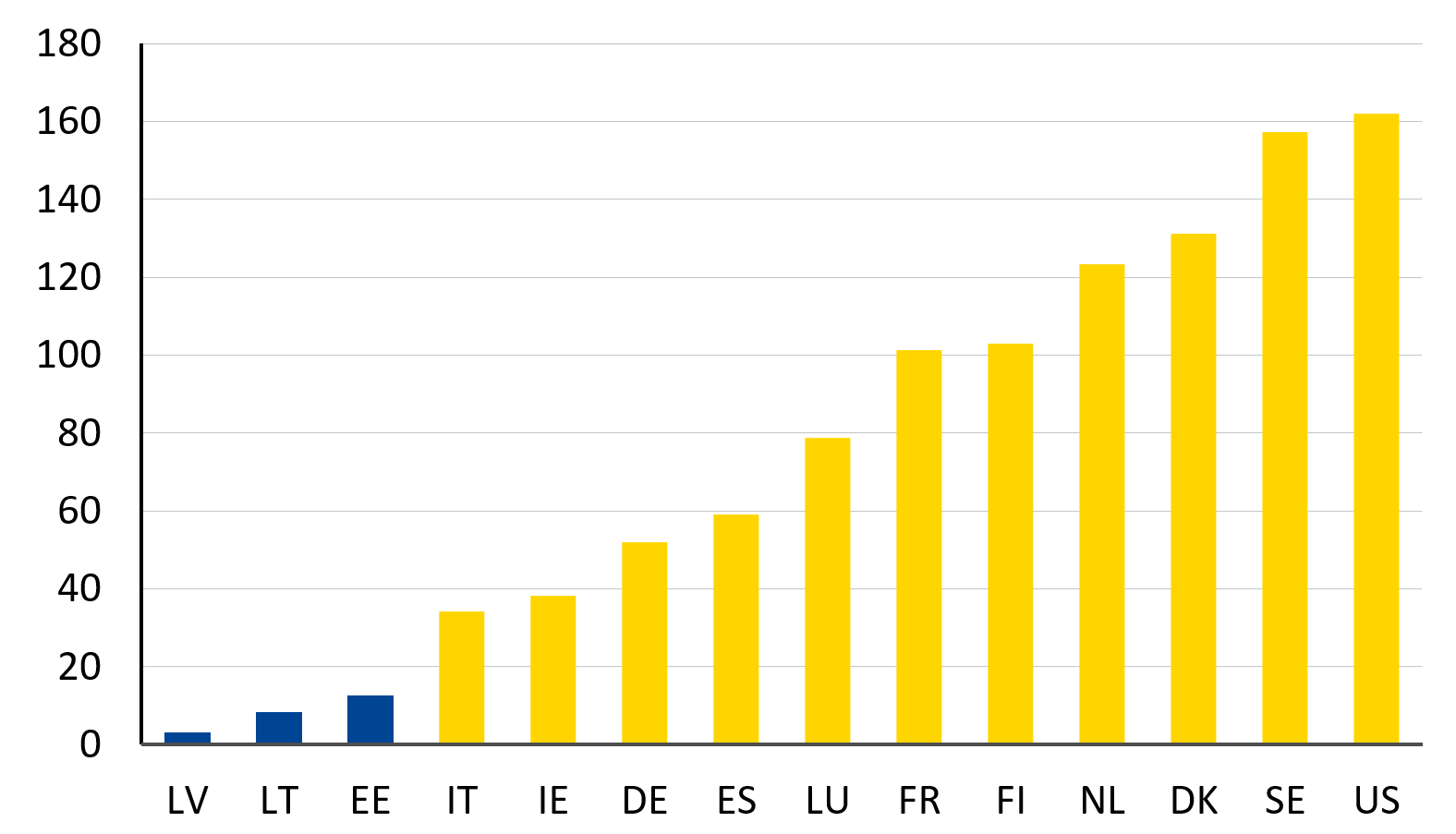 A number of conclusions may be drawn from these observations. While the Baltic financial sector is relatively sophisticated, with a high degree of digitalisation and successful fintech startups, household wealth and saving rates are lagging behind European peers. Similarly, while Baltic countries were early movers in enacting reforms that sought to increase the role of funded pension schemes, these have not contributed as much to the development of domestic capital markets, compared to Scandinavian peers like Sweden and Denmark.