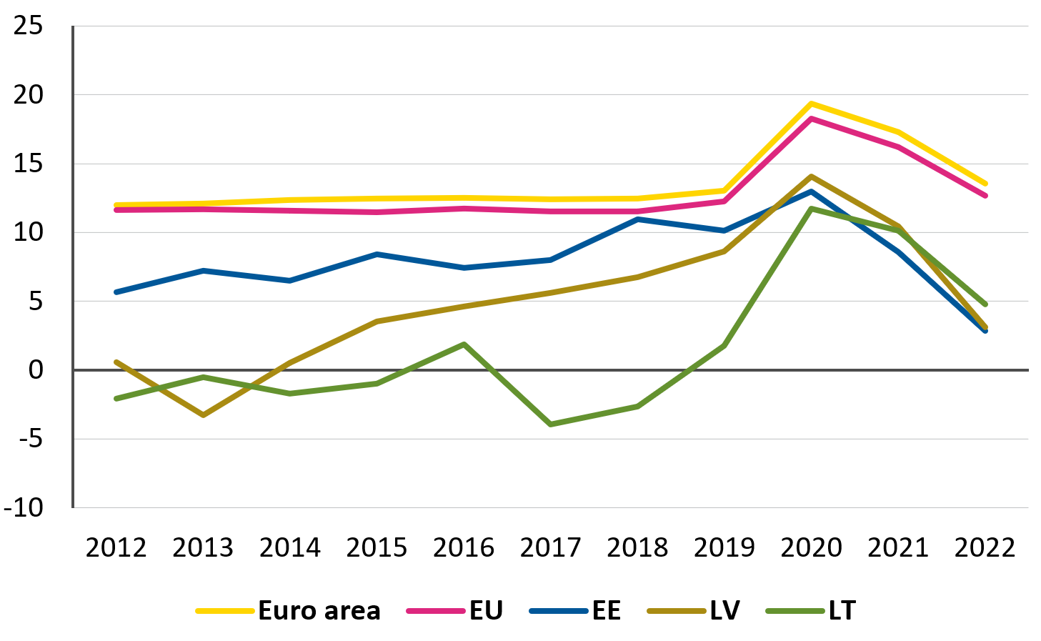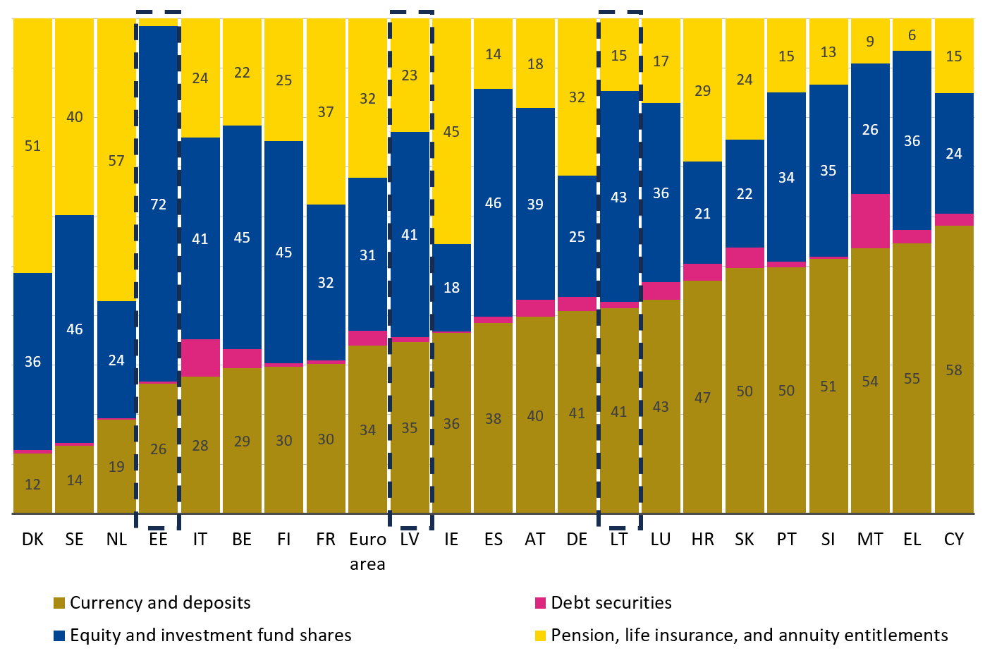 Turning to the allocation of their savings, there is substantial variation across the Baltic countries, with Estonian households allocating the largest share of savings (72%) to equity and investment fund shares of all European countries[5] and a relatively low share to deposits. Latvian and Lithuanian households meanwhile allocate a share of their savings to deposits that is similar to, if slightly higher than, the euro area average.