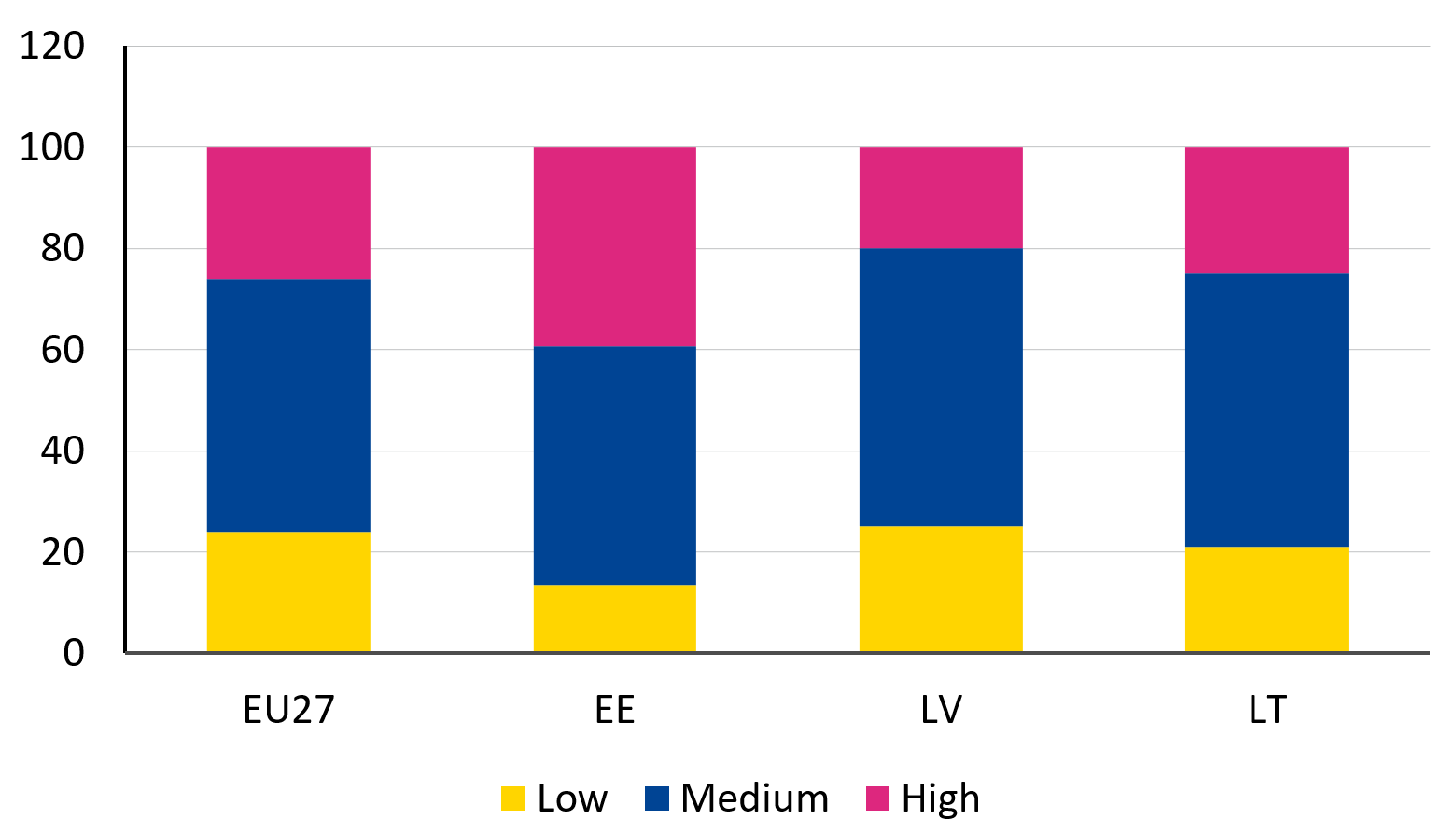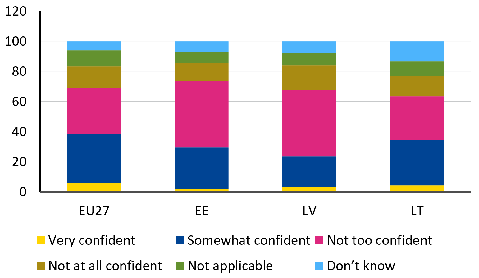 This, in turn, reflects a sound level of financial literacy among the general population, with Estonia scoring significantly higher than the EU 27 average in the 2023 EU Barometer survey, Lithuania somewhat higher and Latvia just below (Figure 3a).[6] However, trust in investment advice received from banks and financial advisors is relatively low (Figure 3b).[7]