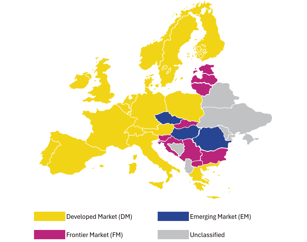 Note: Classification of stock markets in accordance with FTSE methodology. Cyprus and Malta are also classified as frontier markets, but not shown in this visualisation.
