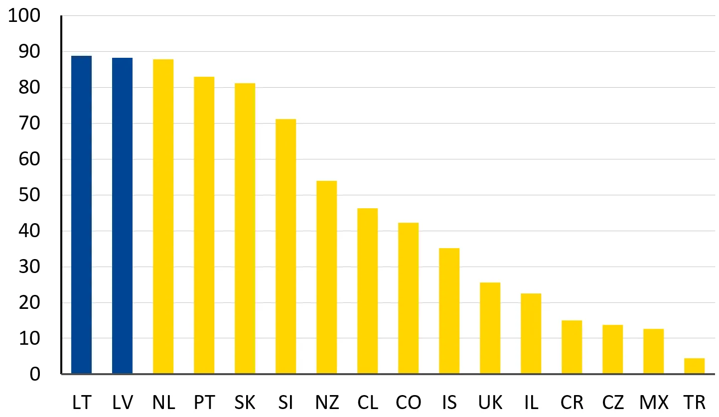 The Baltic countries are in close proximity to each other, and their citizens share similar values (Figure 9b), making it easier for local firms to reach both clients and investors in all three countries. The population is financially and digitally literate (Figure 3a and 9a), which facilitates political initiatives to broaden retail participation in capital markets. The banking sector also features a large presence of Nordic bank subsidiaries, who have a long experience of offering investment savings accounts to customers in their home markets.