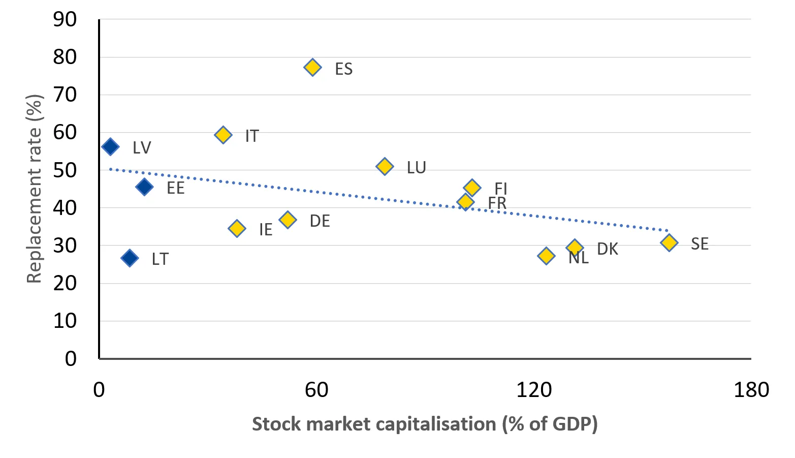 Note: Stock market capitalisation to GDP is averaged over 2014-2022, while replacement rates are for 2022.