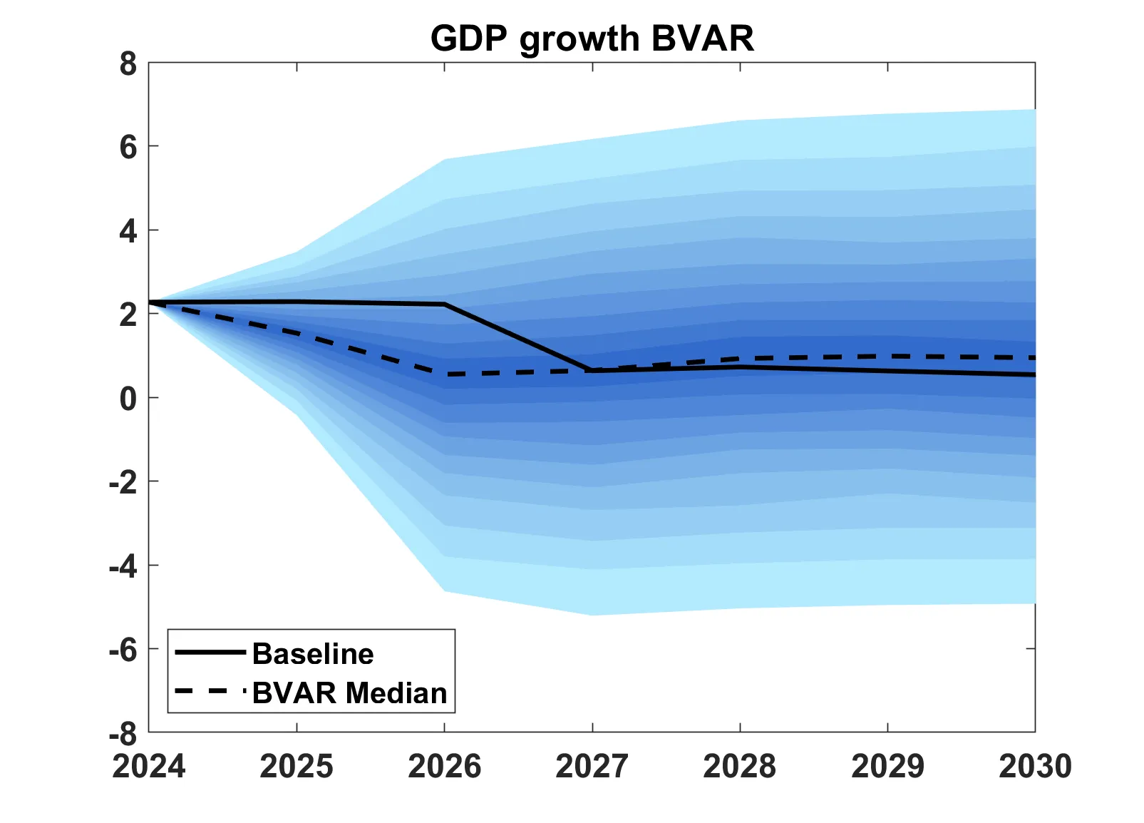 A relatively symmetric chart can occur either because the BVAR forecasts closely match the baseline, or because differences across individual debt drivers cancel each other out.
