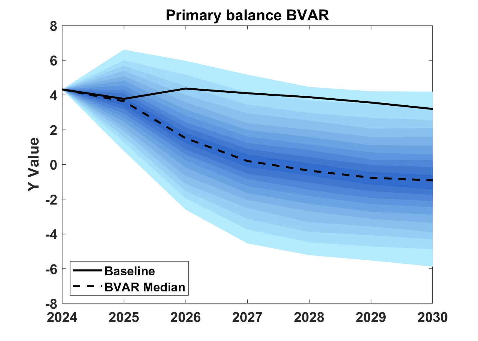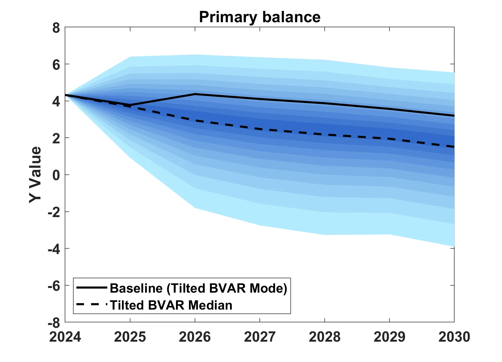 Fan charts for each debt driver provide a benchmark to assess the plausibility of their baseline assumptions in light of historical evidence. Since the deterministic baseline typically builds on the European Commission’s latest forecast, which combines model results with expert judgment, as well as on a set of mechanical assumptions for the medium term[7], it often differs from the BVAR projections. This divergence is informative: reflecting on the “disagreement” between the two helps assess the likelihood that the baseline may turn out to be optimistic or pessimistic, thereby offering insights into the direction of risks (see also the IMF’s DSA framework for market access countries).