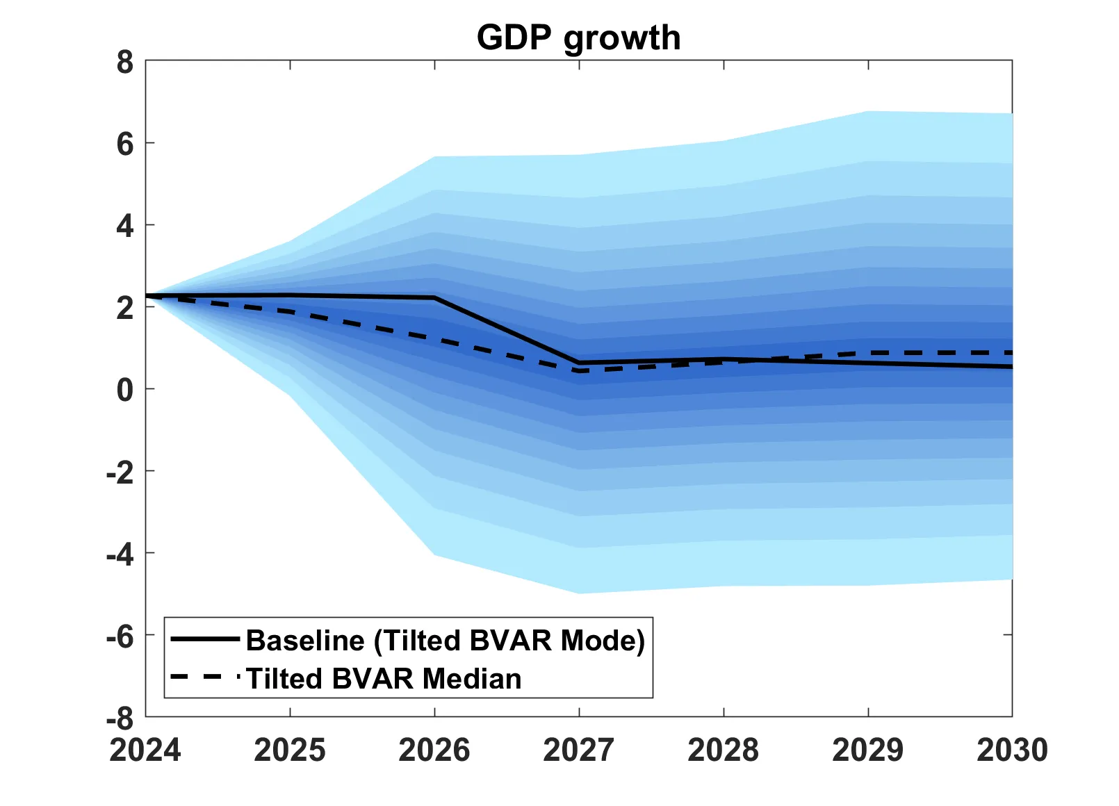 In the second step, the deterministic baseline is combined with the BVAR simulations. The baseline information is used to adjust the BVAR forecasts so that they better align with expert and institutional projections. The procedure adjusts the model’s forecast distribution for each debt driver so that it places greater emphasis on outcomes close to the deterministic baseline.