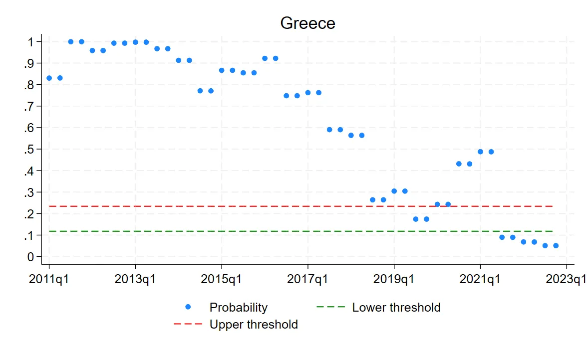 This probability signal is then mapped into three risk zones using two thresholds: i) the lower threshold separating low from medium risk, and ii) the upper threshold separating medium from high risk. Thus, for any quarter, a country is classified as low, medium, or high risk depending on its estimated probability of market access distress relative to the two thresholds. Thresholds are set following the IMF’s approach in the medium-term module of the Debt Sustainability Framework for market access countries. They are calibrated on historical data to minimise misclassification: the lower threshold allows a missed crisis rate of up to 10%, while the upper threshold is chosen to keep the false alarm rate below 10%.[10]