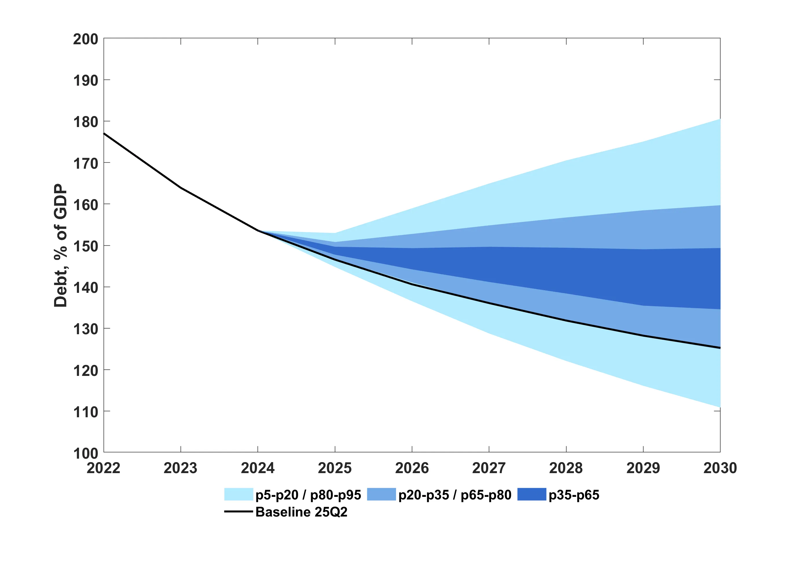 By contrast, a strongly asymmetric chart signals that some baseline assumptions differ substantially from historical patterns. To fully understand the results, the final debt fan chart should always be considered together with the individual debt-driver fan charts, which highlight the main sources of risk.
