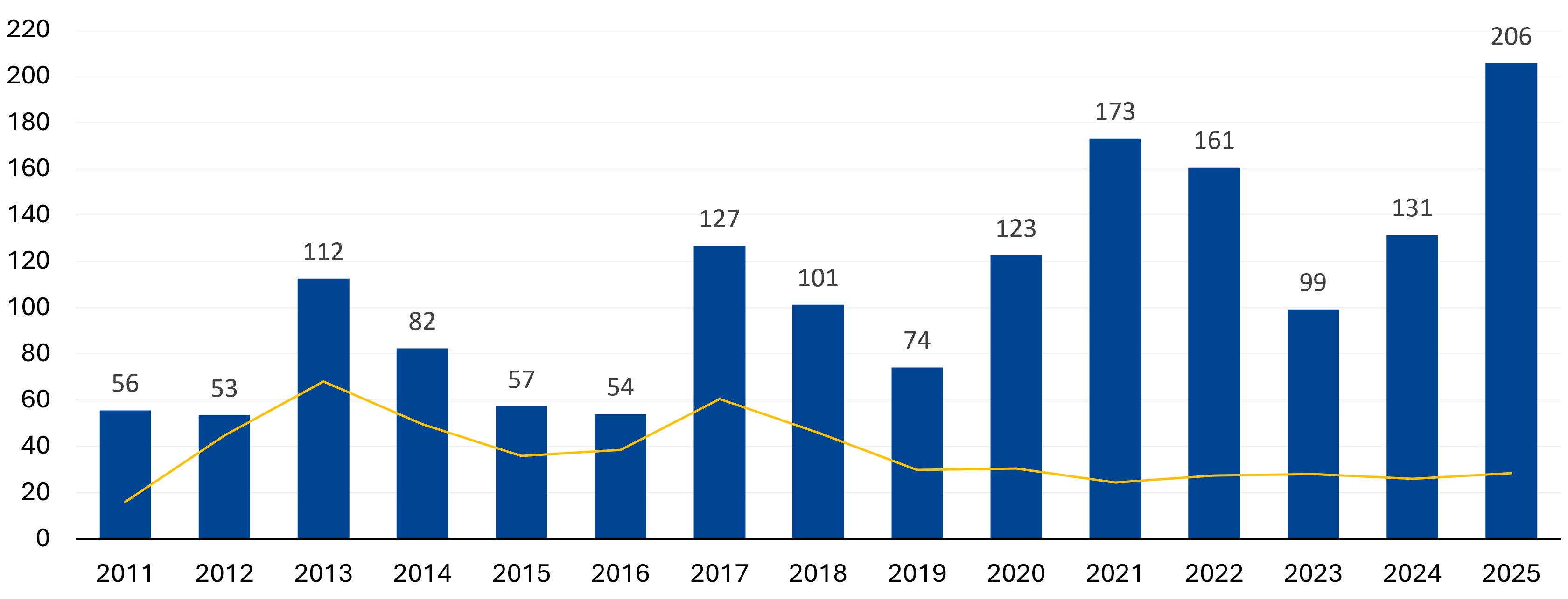 In 2025, we saw the largest order books in history for the EFSF and ESM (see Figure 8), adding almost 40 new investors, like from Latin America. This shows the strong interest for European safe assets.