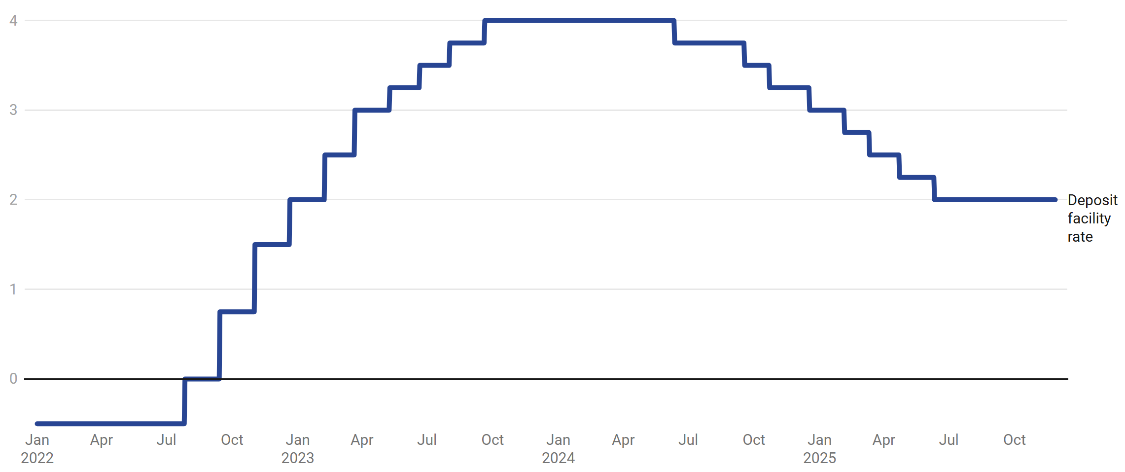 Inflation, which was a major concern in recent years, is now largely under control. The euro area’s headline inflation rate dipped and is moving closer to the European Central Bank’s (ECB) 2% medium-term target. This progress is the result of decisive ECB action: after the fastest rate-tightening cycle in history, the ECB has cut rates back to 2% (see Figure 1), signalling its confidence that price stability is ensured.