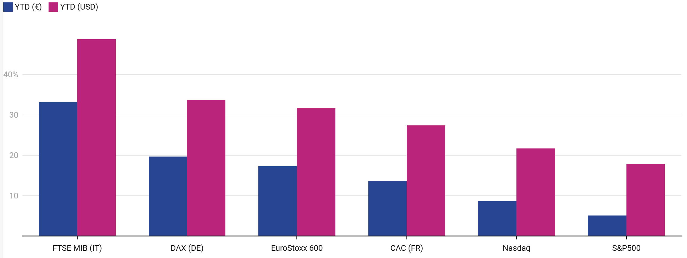 European financial markets have responded positively to these developments. Equities have performed well, with the EuroStoxx 600 index up 17.3% year-to-date and notable gains in sectors such as utilities, oil and gas, and food and beverage. Major European stock markets so far beat United States (US) stock markets in 2025, with Italy’s FTSE, France’s CAC, Germany’s DAX, and the region-wide EuroStoxx 600 all outperforming the S&P 500 and Nasdaq (see Figure 3).
