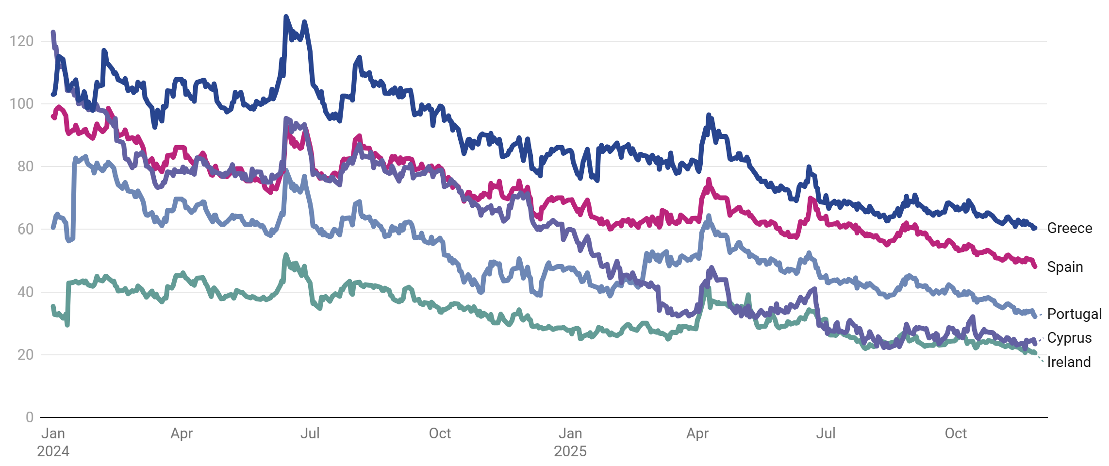 This good performance reflects improved fiscal discipline and growing market confidence. These countries have seen rating upgrades. Furthermore, Portugal (1st), Ireland (2nd), Spain (4th) and Greece (6th) have again ranked in the Economist’s top 10 of best performing global economies this year.[1] It shows the countries’ success, which will continue in 2026.
