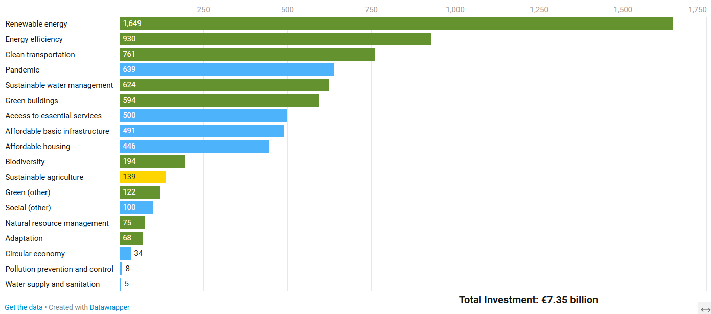 These bonds provide competitive liquidity and return – with some green bonds even trading at a premium (‘greenium’) compared to conventional bonds, reflecting investor willingness to receive a slightly lower yield in support of sustainability objectives – while also enabling investors to observe the tangible impact of their investments. The ESM therefore examines the subcategories across its ESG-labelled bond holdings to better understand the environmental and social outcomes of its investments.