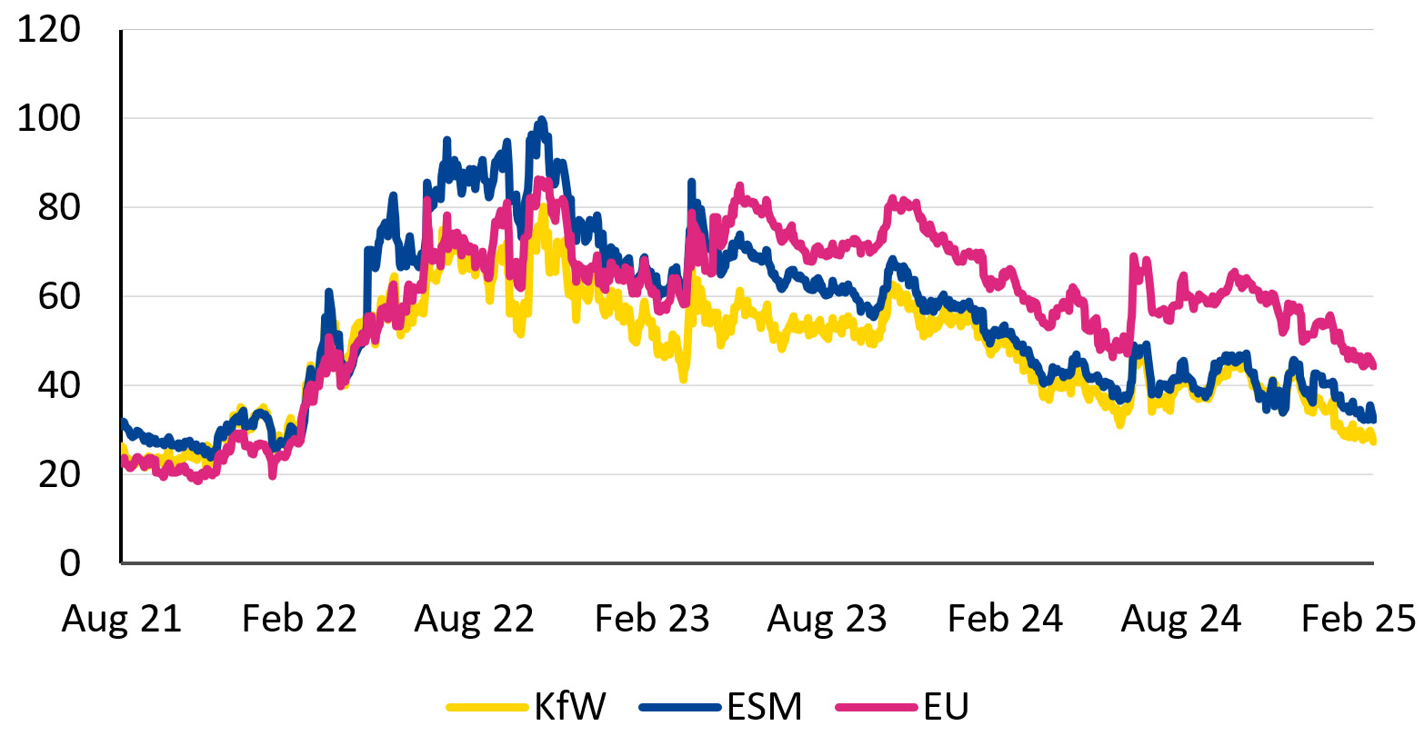 By 2024, this trend went into reverse. Monetary policy has been easing, bringing swap rates down, while bond supply has been rising and putting upward pressure on yields. Bond yields have risen across the board since October, with German and French government yields rising by about 40 basis points as of February. Consequently, the difference between swap rates and Bund yields has evaporated (Figure 3). [6] European supranationals showed resilience with a more limited increase in yields of around 30 basis points, broadly in line with the rise in KfW’s yields which carries a credit risk seen as directly aligned with the German sovereign.