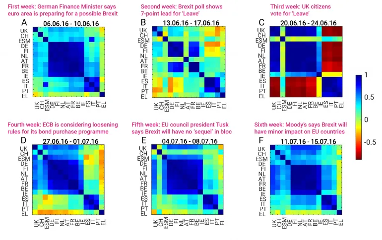 The following week, the situation changes, as some polls indicate a possible victory for the Leave campaign.The periphery countries’ correlations with Germany, the Netherlands, and Finland turn slightly negative (Heatmap 1B).