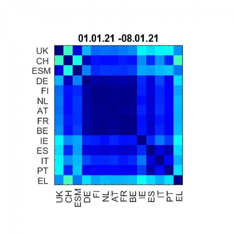 In the second week of June 2016, two weeks ahead of the Brexit referendum, we see two highly correlated groups. The first highly correlated core group consists of Germany, Finland, Netherlands, Austria, France, Belgium, and Ireland. The periphery countries Spain, Italy, and Portugal form a second highly correlated group, still positively correlated with the core countries (Heatmap 1A).