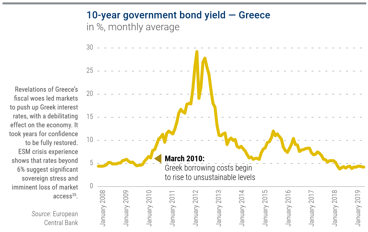 The euro’s prospects darkened in October 2009, when a newly elected Greek government led by George Papandreou announced that the country’s budget deficit was a lot higher than initially reported. When the incoming administration reviewed the figures, they saw that the country’s budgetary gap, or the shortfall between revenues and spending, was projected to be around 12.5% of gross domestic product (GDP)[1]. That contrasted with the 3.7% of GDP projection submitted by the previous government and was four times the maximum threshold of 3% set out in the euro area’s budget guidelines.