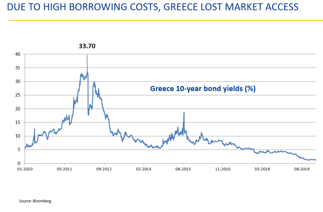Looking at this chart, we can see how the yields were rapidly increasing in 2010 up to early 2012, when Greece would have had to pay almost 34% for a 10-year bond.