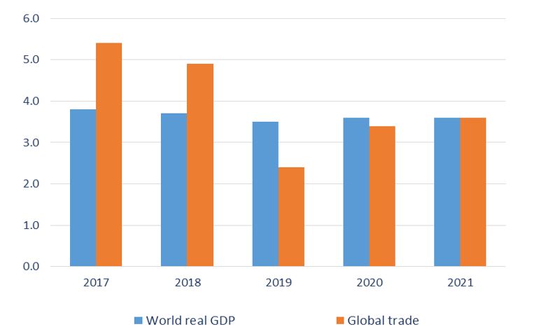 According to Eurostat preliminary data, euro area growth in the first quarter of 2019 has surprised on the upside with an annual growth of 1.2%. This suggests some resilience of the economic outlook, based on continued employment growth and wage increases supporting disposable income. In fact, most forecasts by international and other official institutions released over the past months suggest some rebound of growth in 2020. By then, global trade is expected to somewhat accelerate again to levels comparable to global growth (see Graph 2).