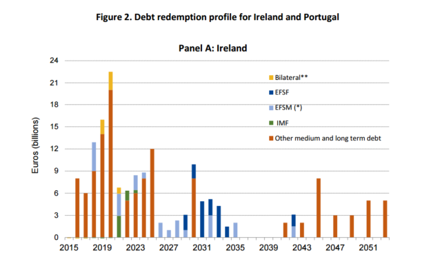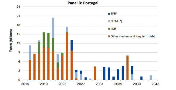Note: * EFSM loans are subject to a 7-year extension. It is, therefore, not expected that Portugal will have to refinance any of its EFSM loans before 2026 and Ireland before 2027. ** The bilateral loans for Ireland were provided from the United Kingdom, Sweden and Denmark. Source: National Debt Management Offices, ESM staff calculation