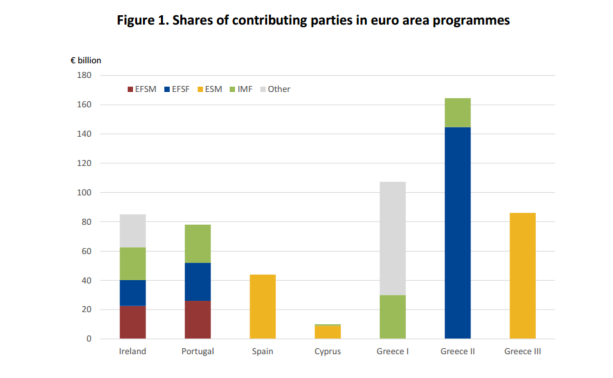The IMF and the European crisis resolution mechanisms have complementary financial instruments. In practice, the IMF participated in the co-financing for most of the euro area programmes. The IMF’s committed financing reached 26% for Ireland, 33% for Portugal, 28% for the first Greek programme and 10% for Cyprus (see Figure 1). However, the IMF could not financially complement the European programme for Spain, where it does not have specific instruments dedicated to bank recapitalisation. In this case, it provided technical assistance. The ESM has, in addition, the ability to directly recapitalise banks and intervene in the secondary market. This shows a stronger focus on intervention directed towards the financial sector.